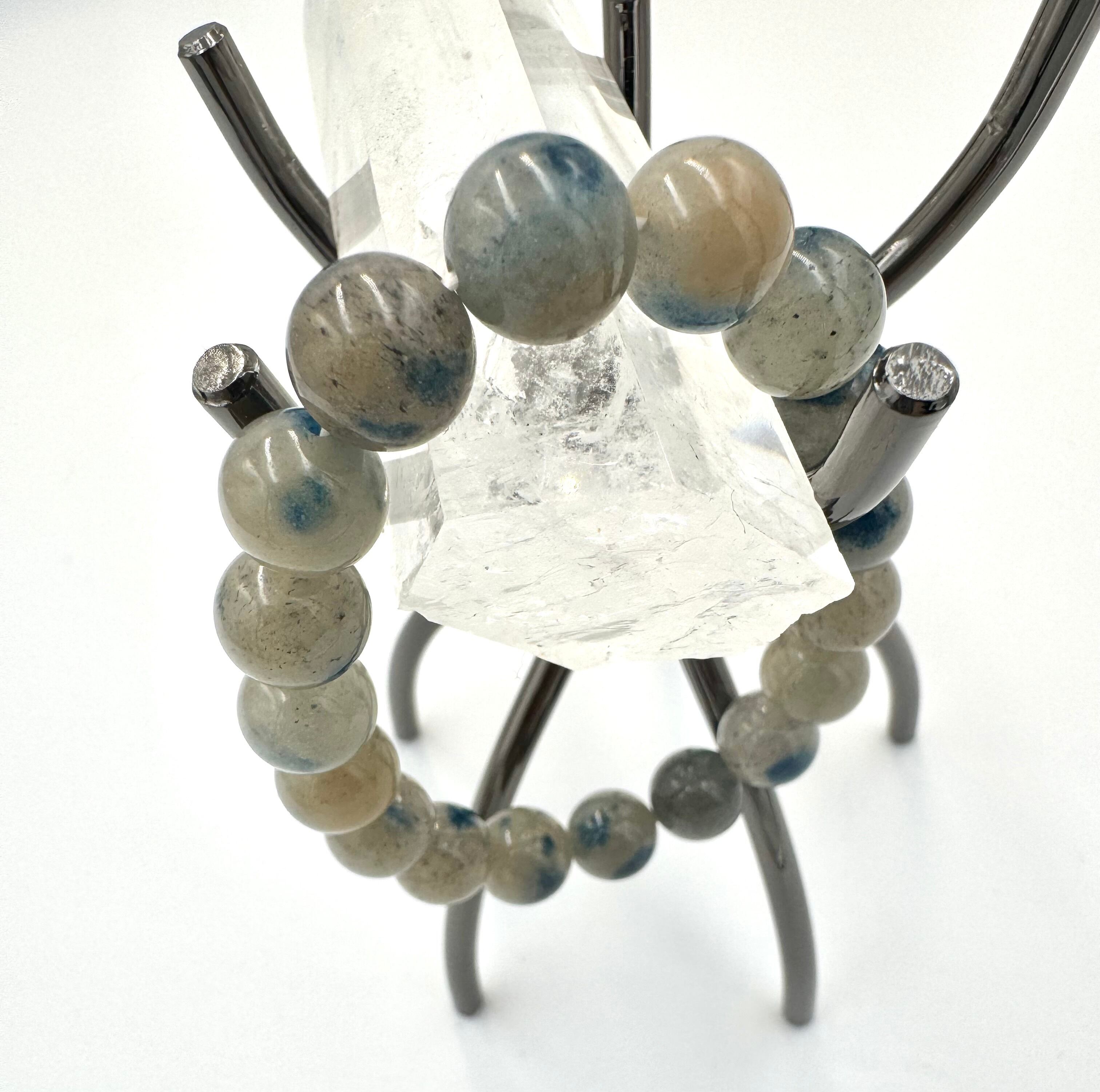 ブルーストロベリークォーツと呼ぶ方もいます。グレーベースの水晶に深青色の水玉模様が入っています。クォーツなのでライトを当てると透明感があります。