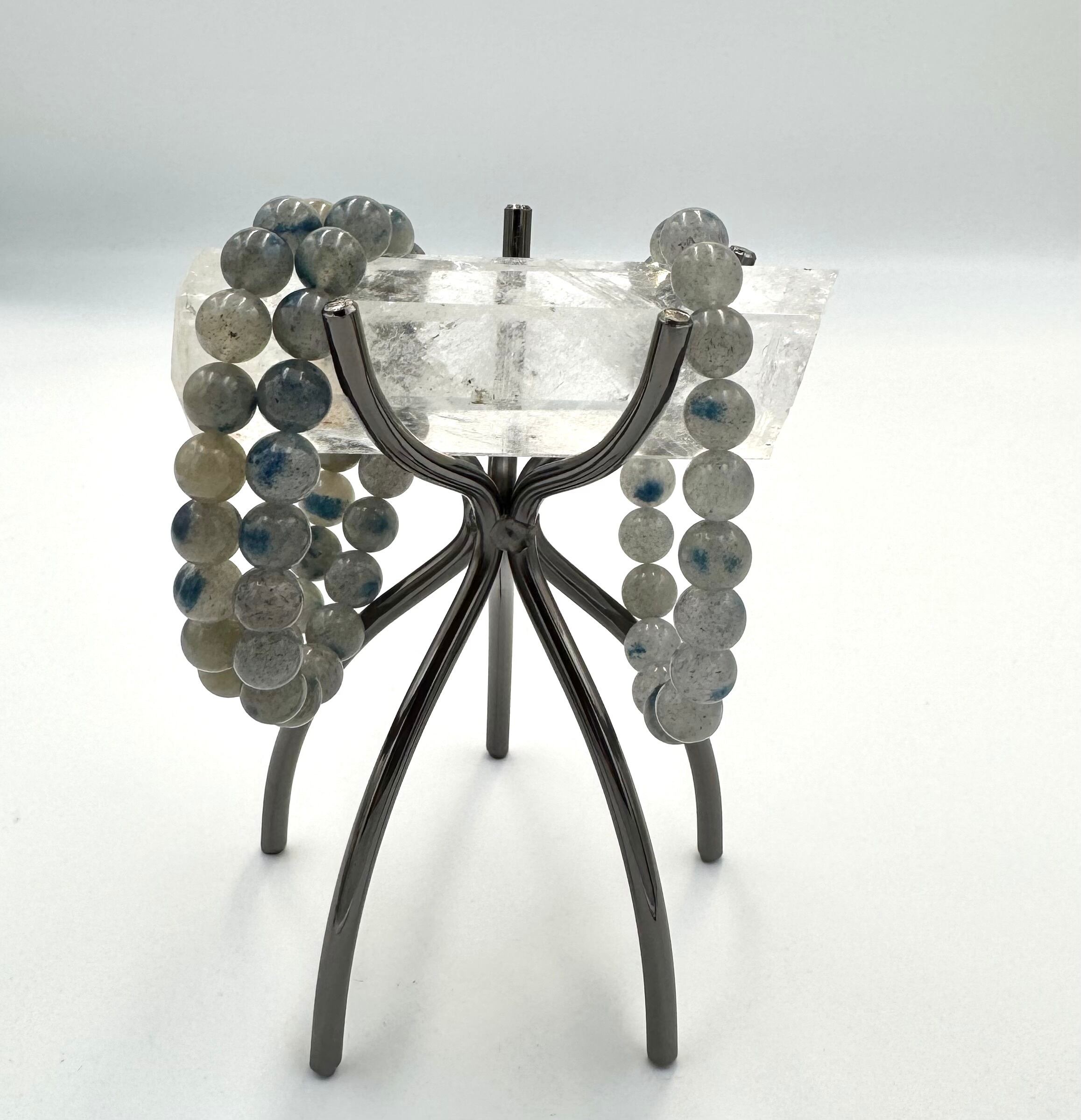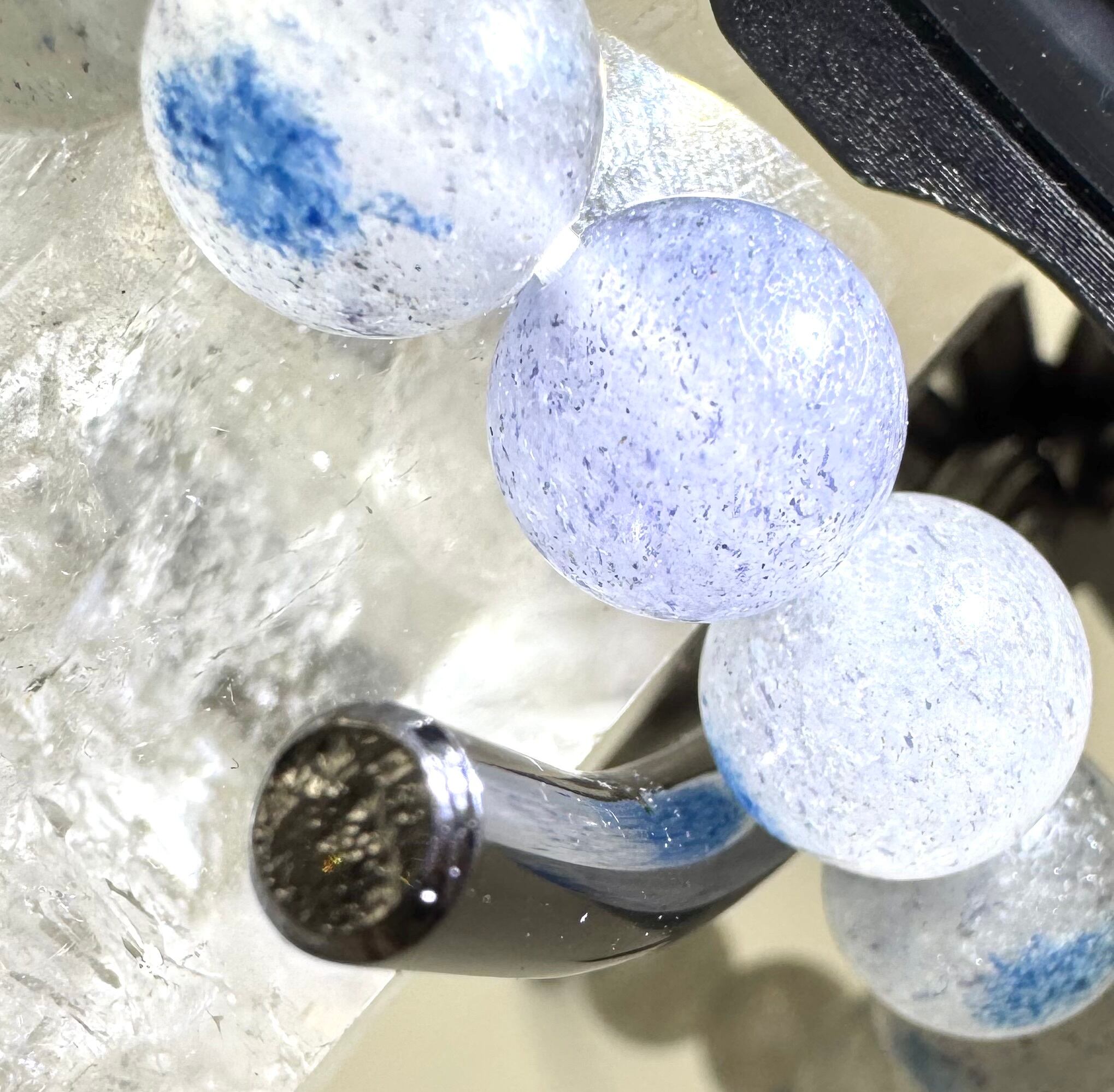ブルーストロベリークォーツと呼ぶ方もいます。グレーベースの水晶に深青色の水玉模様が入っています。クォーツなのでライトを当てると透明感があります。