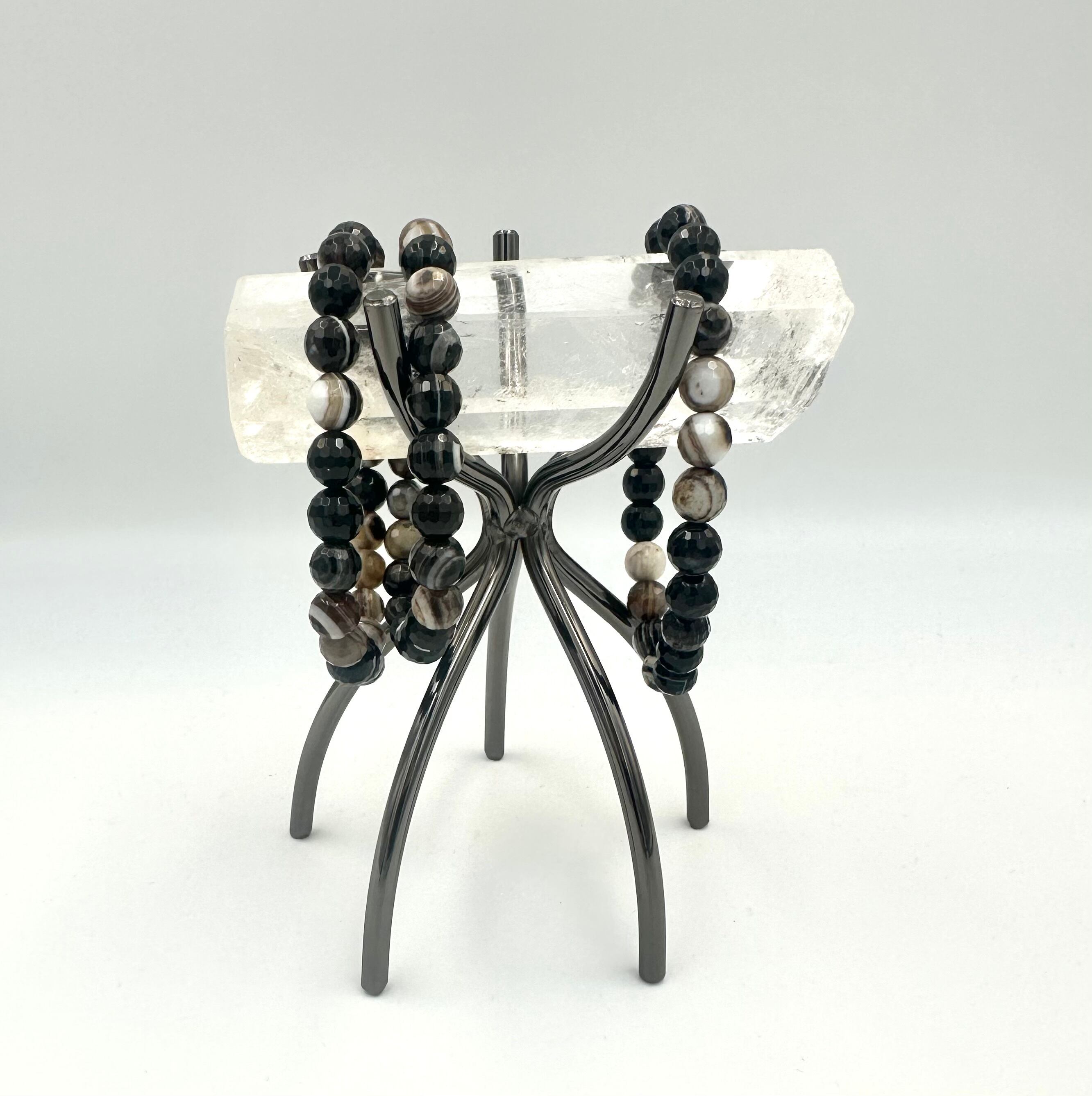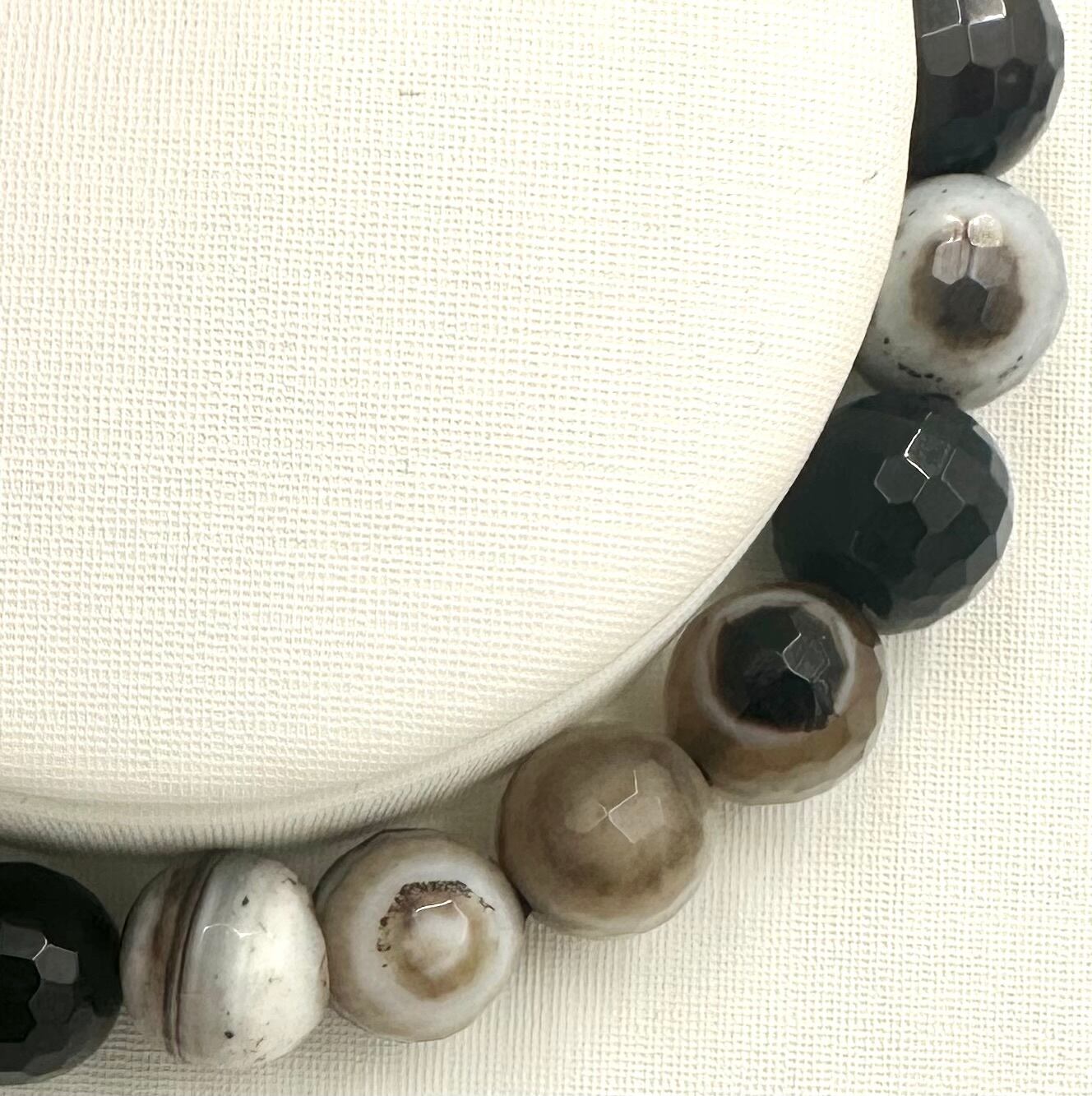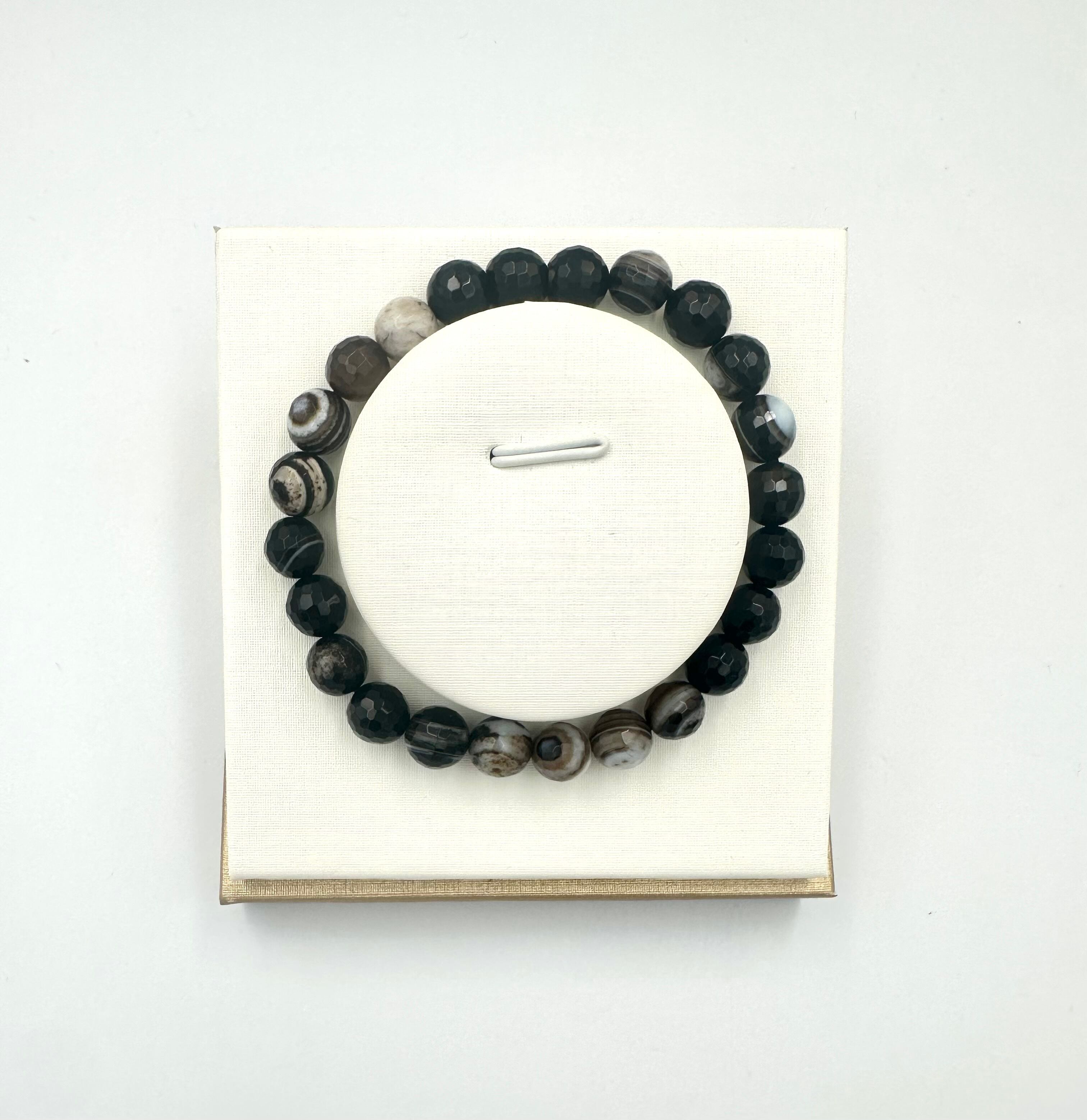 この目の模様は、石が形成される過程でさまざまな鉱物が層状に積み重なって、自然につくられます。模様は一つ一つ違っていて、厄除けや魔除けのお守りとして身につける方も多い石です。ミラーボールのような多面カットになっていますので華やかさと存在感が増したブレスレットとなっています。