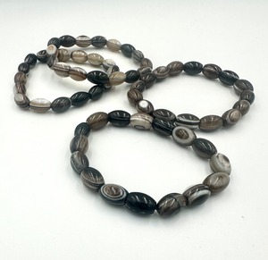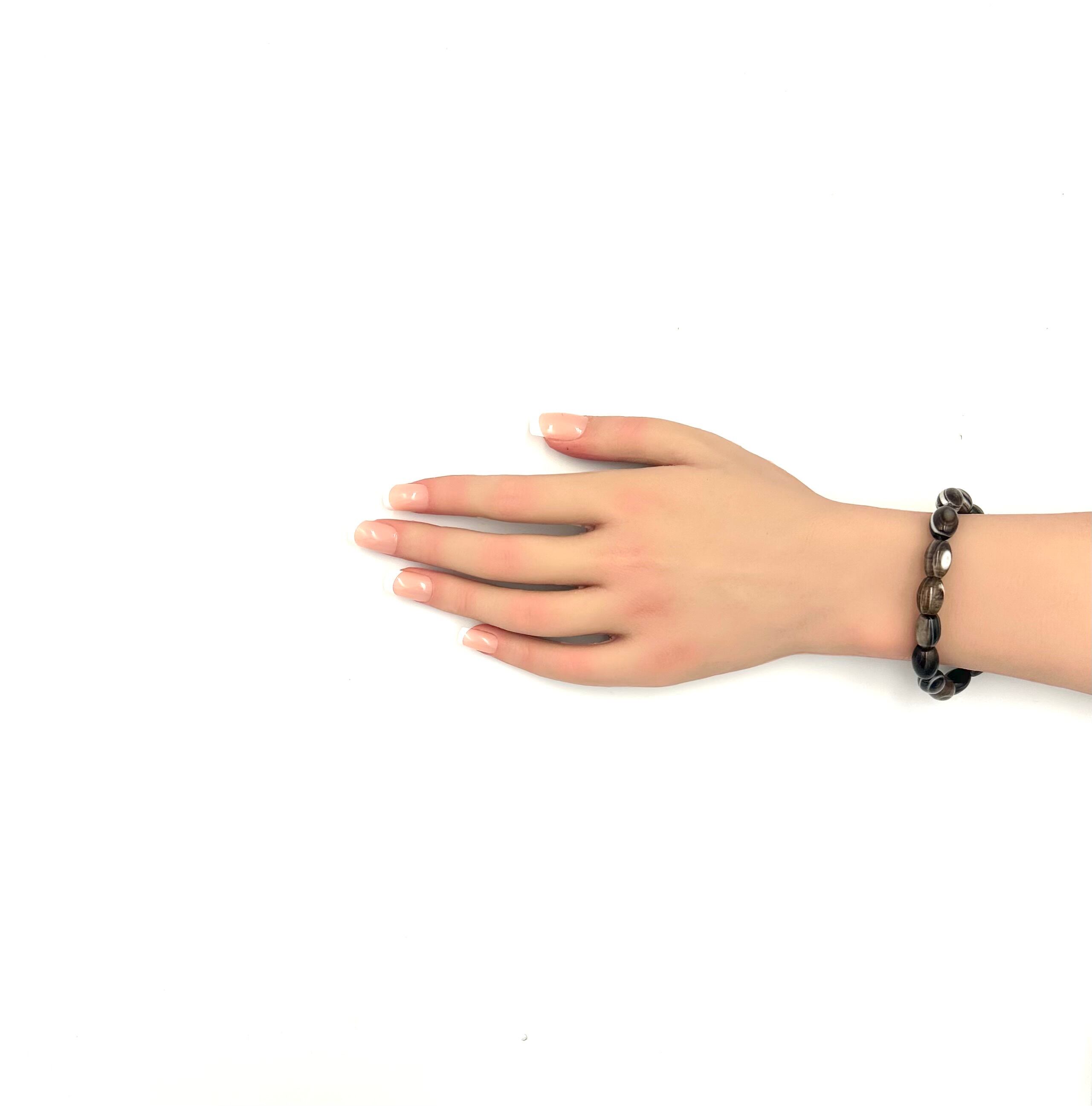 この目の模様は、石が形成される過程でさまざまな鉱物が層状に積み重なって、自然につくられます。模様は一つ一つ違っていて、厄除けや魔除けのお守りとして身につける方も多い石です。ミラーボールのような多面カットになっていますので華やかさと存在感が増したブレスレットとなっています。