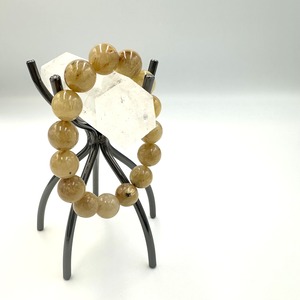 透明な水晶の中に黄金色の針結晶(ルチル)が入り込んだ天然石です。ルチルはチタンの鉱石で、ダイヤモンド以上の屈折率を持ち強く輝きます。金運が注目されがちですが、強運・洞察力・仕事運の向上もあるといわれています。
