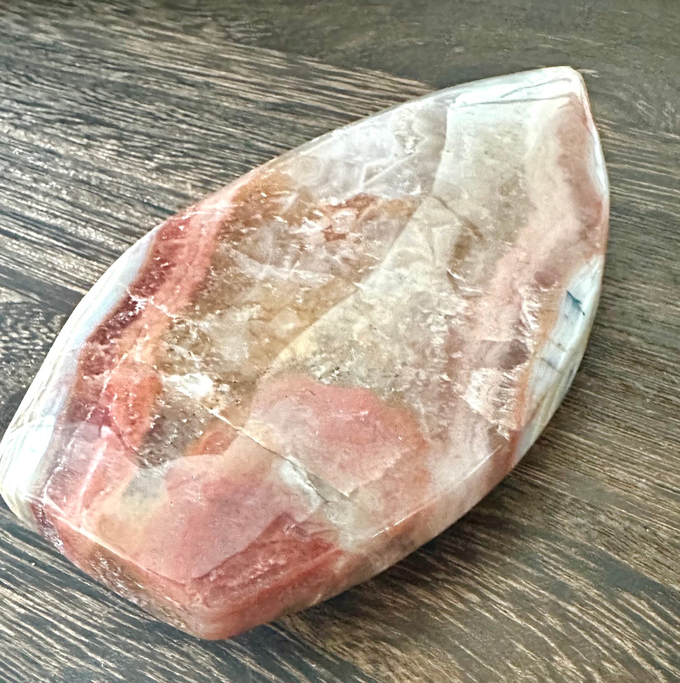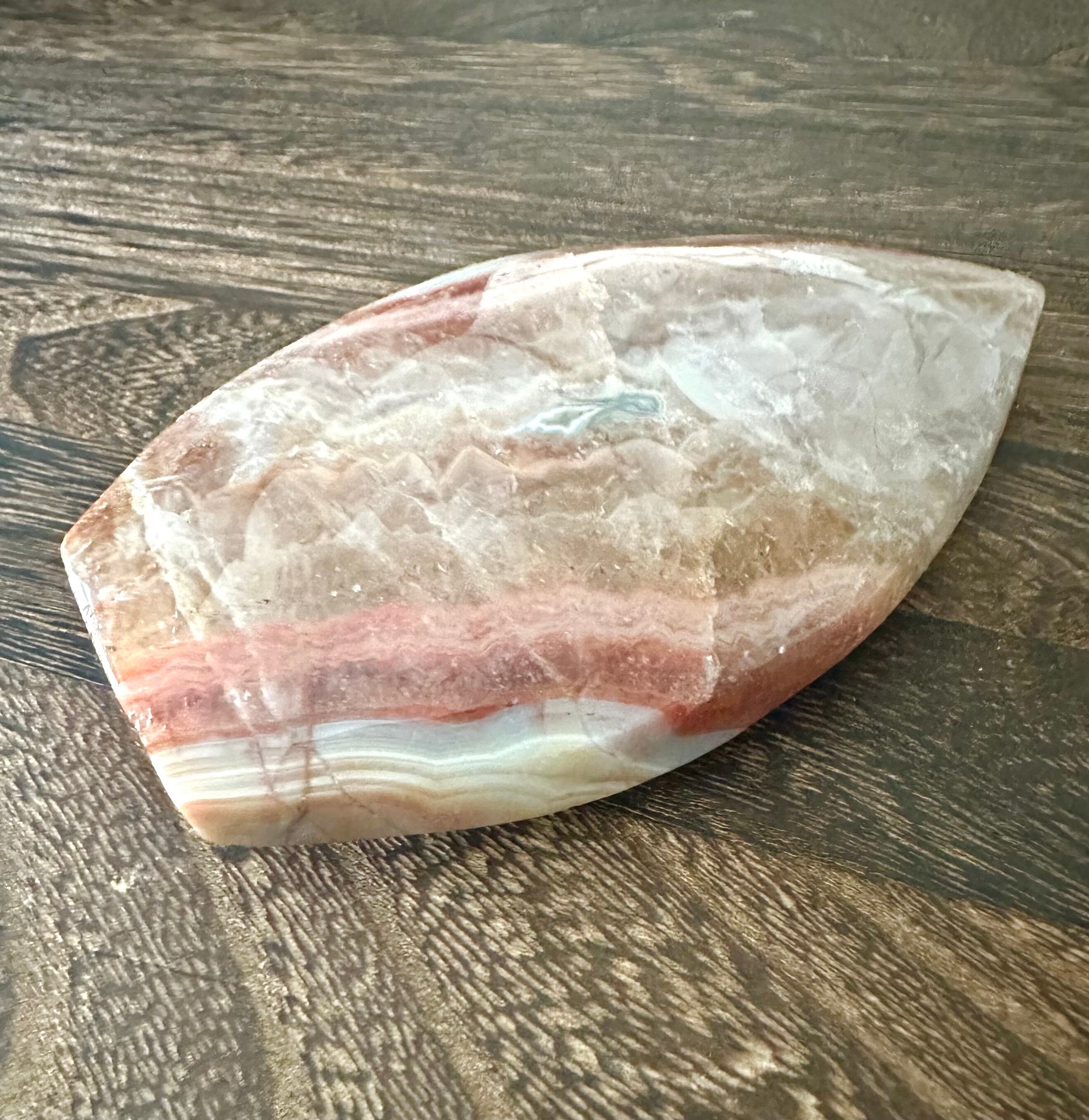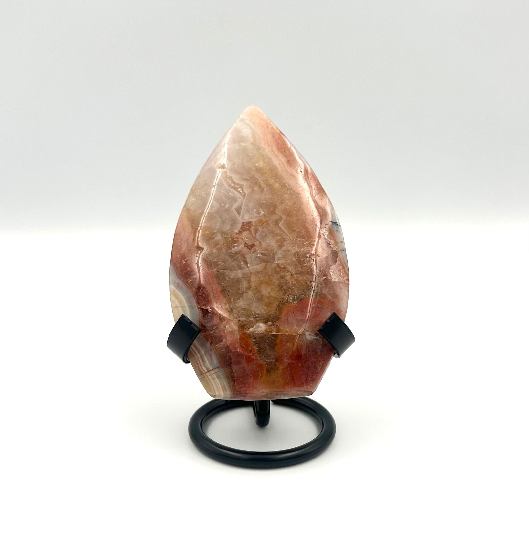 こちらは自立しないので台座付きです。色味が珍しく、ピンクというより赤色・ゴールド味もある色です。「ピンクアメジスト」の線引きが難しいところですがピンアクアメジストの珍しい枠としてご紹介します。天然産物ですのでこの石はこれ、これという線引きが曖昧になることも多いことも魅力です。アゲート(瑪瑙)が共生していて模様になっています。薄型なのでサイズのわりにコンパクトで目立つ色がとても可愛いのでお部屋の飾りとしてアクセントにもおすすめです。