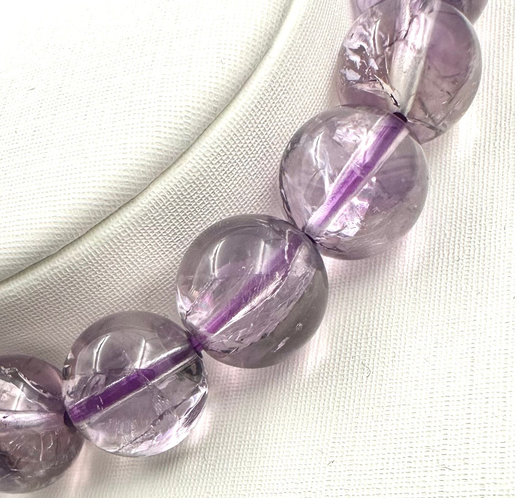こちらは淡い色味と透明感のあるブラジル産アメジストにクラックと虹があるアイリスアメジストと呼ばれる天然石です。今回ご案内のアイリスアメジストは天然クラックタイプになりますので華やかなキラキラとした雰囲気よりも落ち着きのあるキラキラ感です。