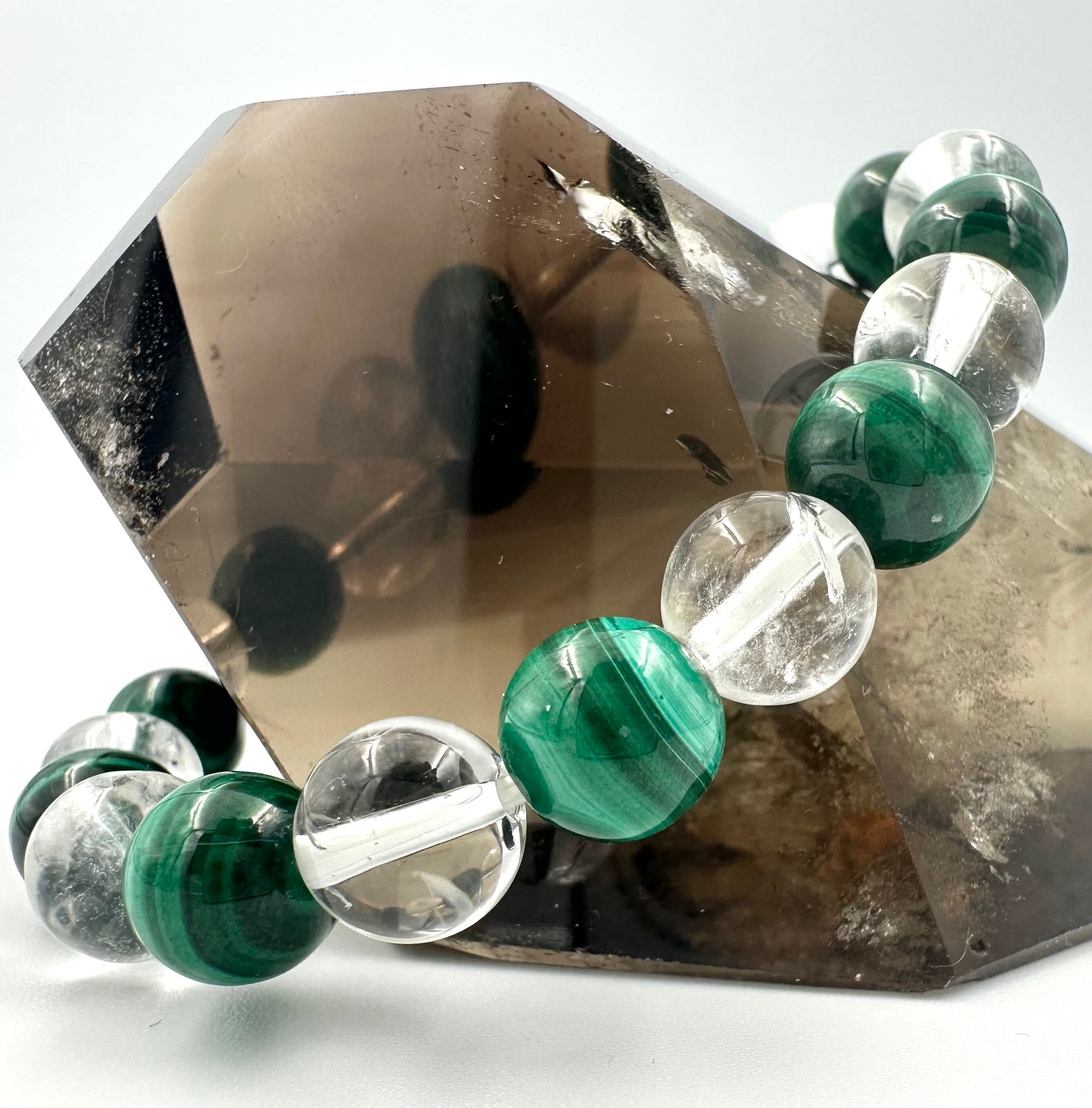 (01130)(1点のみ)(内径選べる)マラカイト クリスタル【9.5-10mm】孔雀石 水晶 クリアクォーツ Malachite Crystal Clear Quartz ラウンドボール ブレスレット 魔除け 厄除け 天然石 パワーストーン
