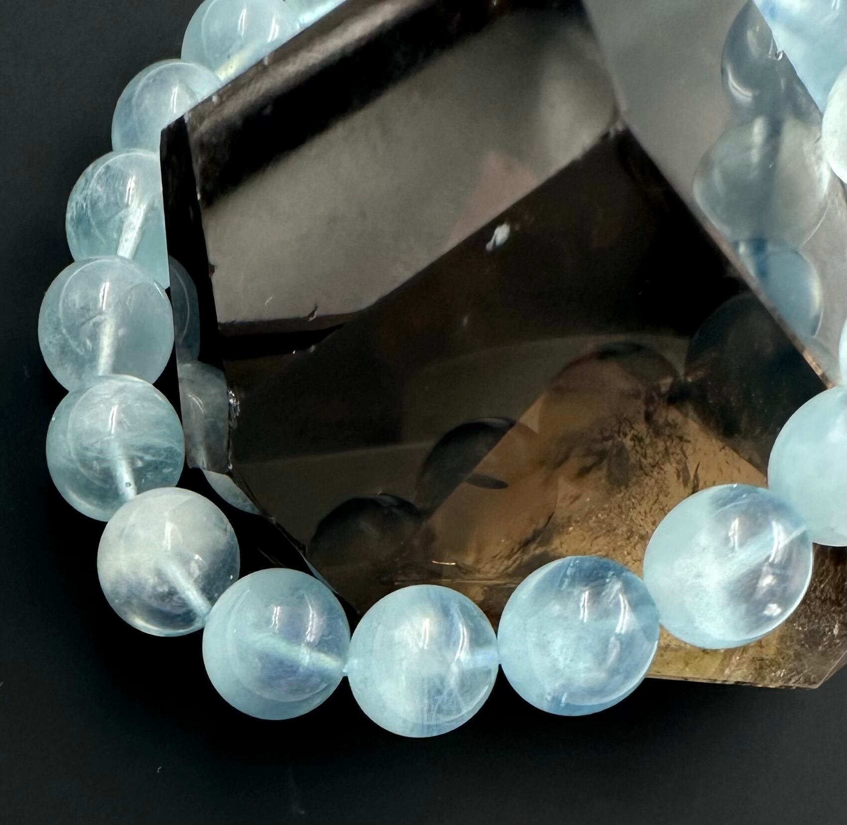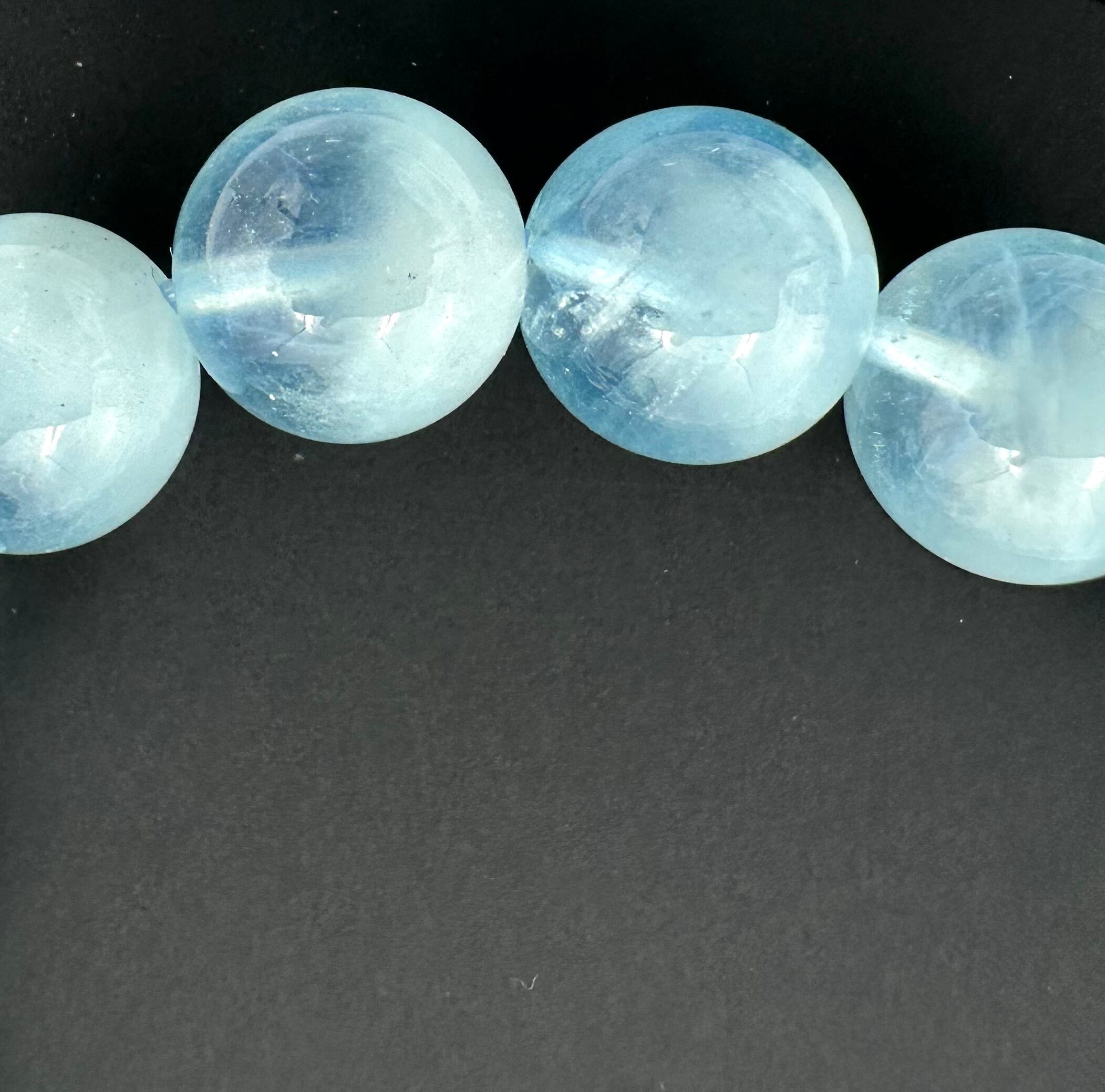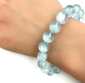 ▷こちらは(b)のタイプです。ベビーブルーより透明感がある品質の良いアクアマリンです。サイズも色も王道のアクアマリンという感じです。実はこちらはビーズ1つ1つではなくブレスレット全体的がグラデーションカラーになっています。透明感がありますが内包物が入ってて、それが模様のように並んでいます。ブルーのキャンディに綿菓子が入っているみたいです。腕にはめていても見えるので眺めてみてください⭐︎天然石らしい美しさを持っています。アクアマリンはコレクターの方も多いですが、まずこちらはいかがでしょうか。お探しの方はぜひご検討ください。