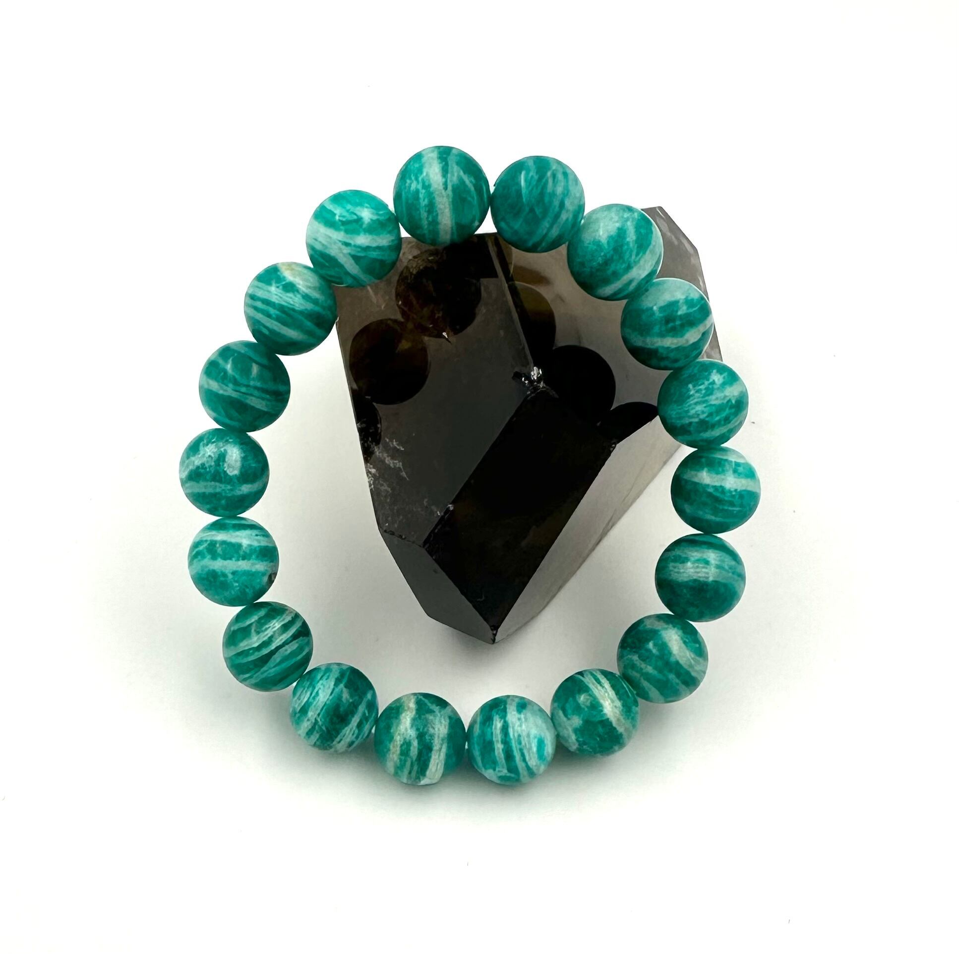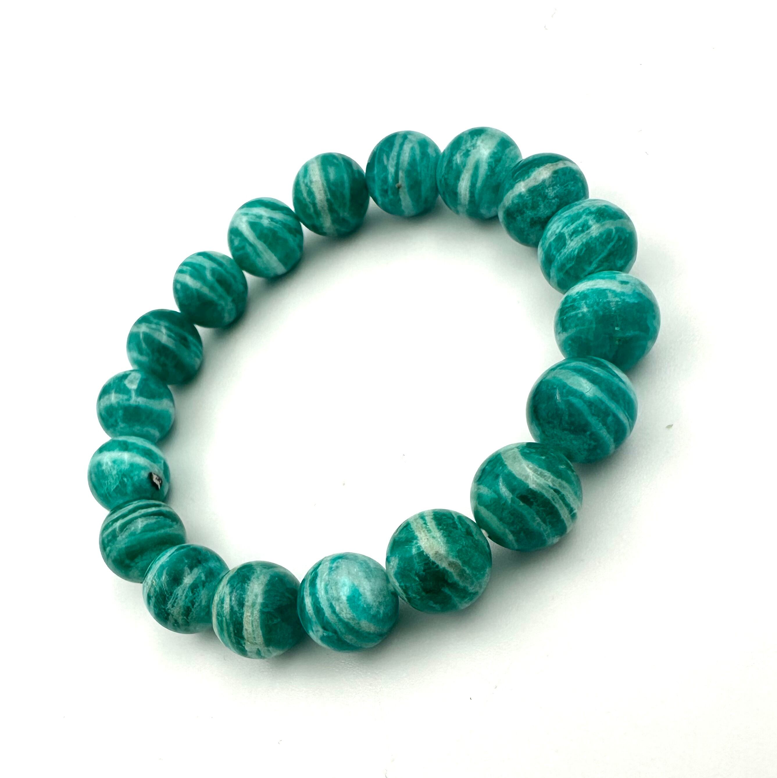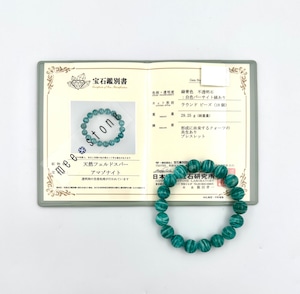 濃いブルーグリーンに縞模様。鑑別書にも記載がありますが、石はもちろん色も天然色です。アマゾナイトは価格もグレードも幅広く見かけますが、世界中に愛されている天然石です。お好きな方はぜひ手に取っていただきたいブレスレットです。