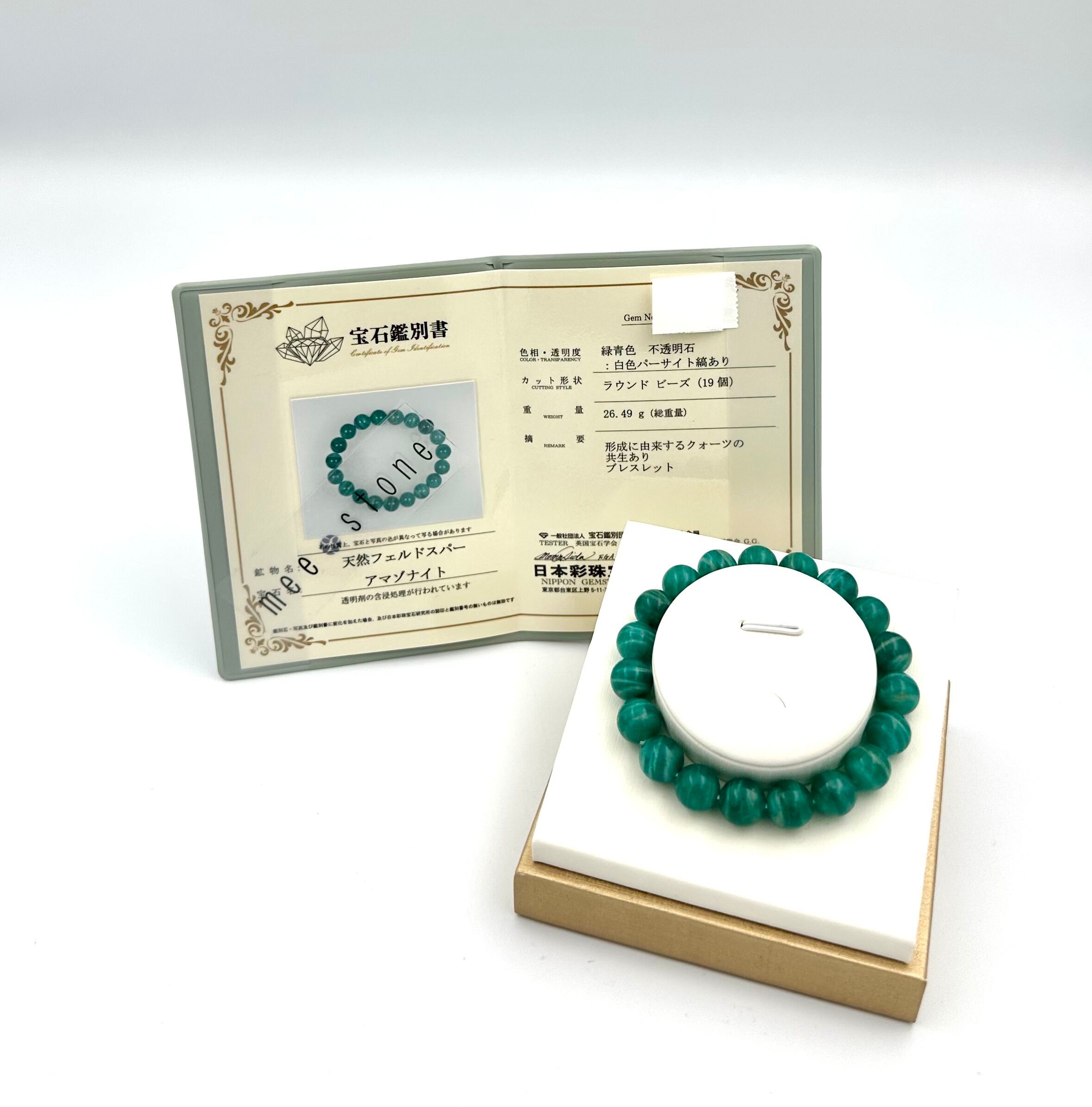 今回ご紹介のアマゾナイトはロシア産です。こちらは国内機関による鑑別書がつきます。販売サイトならびにオフライン販売での共通在庫となりますので、予告なく販売終了となる可能性がありますのでお早めにご検討ください。最近は偽物(人工石、ガラス製、着色なども含む)が出回っています。ご心配な方は鑑別書付きのもののご購入をお勧めします。