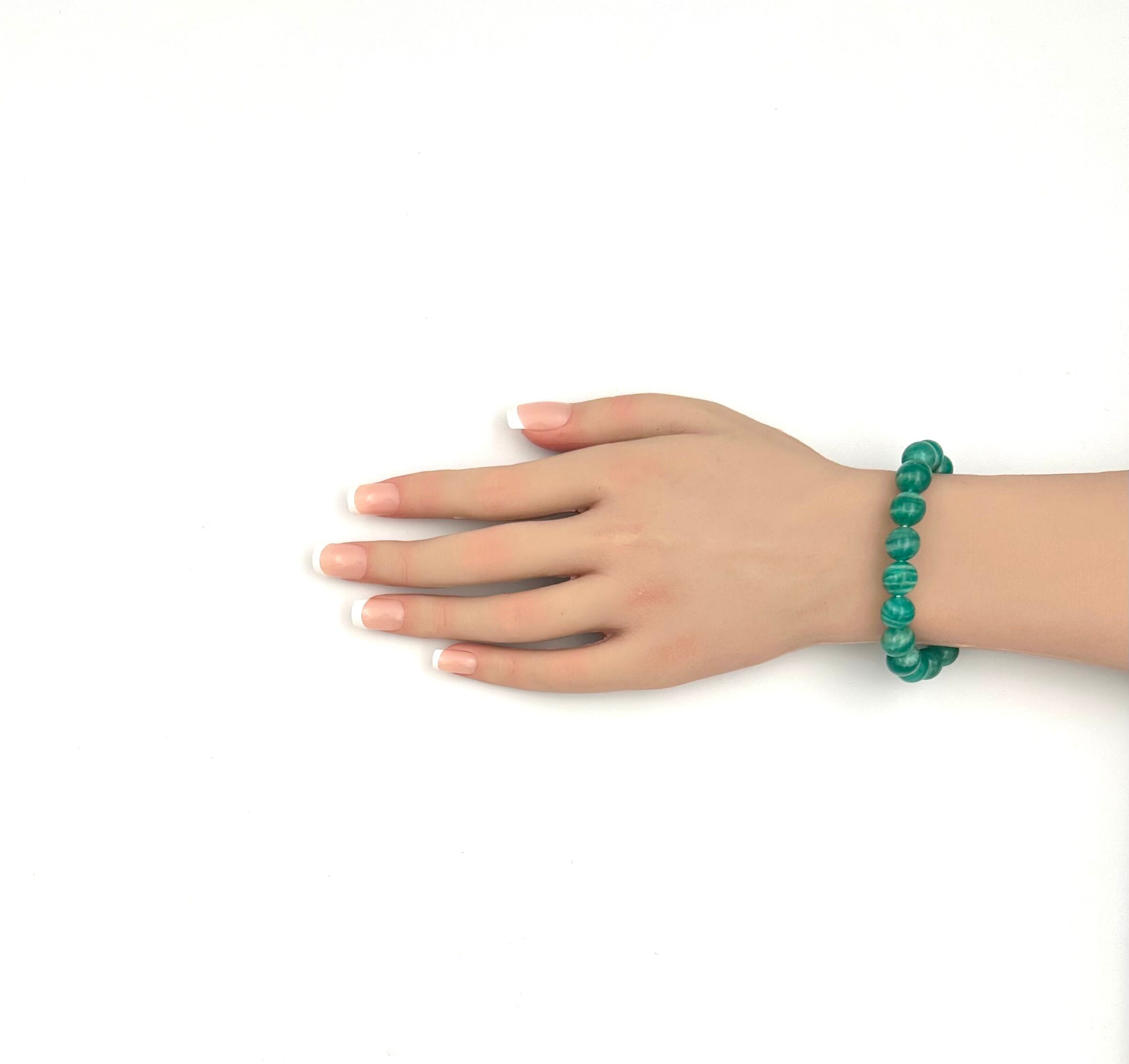 濃いブルーグリーンに縞模様。鑑別書にも記載がありますが、石はもちろん色も天然色です。アマゾナイトは価格もグレードも幅広く見かけますが、世界中に愛されている天然石です。お好きな方はぜひ手に取っていただきたいブレスレットです。